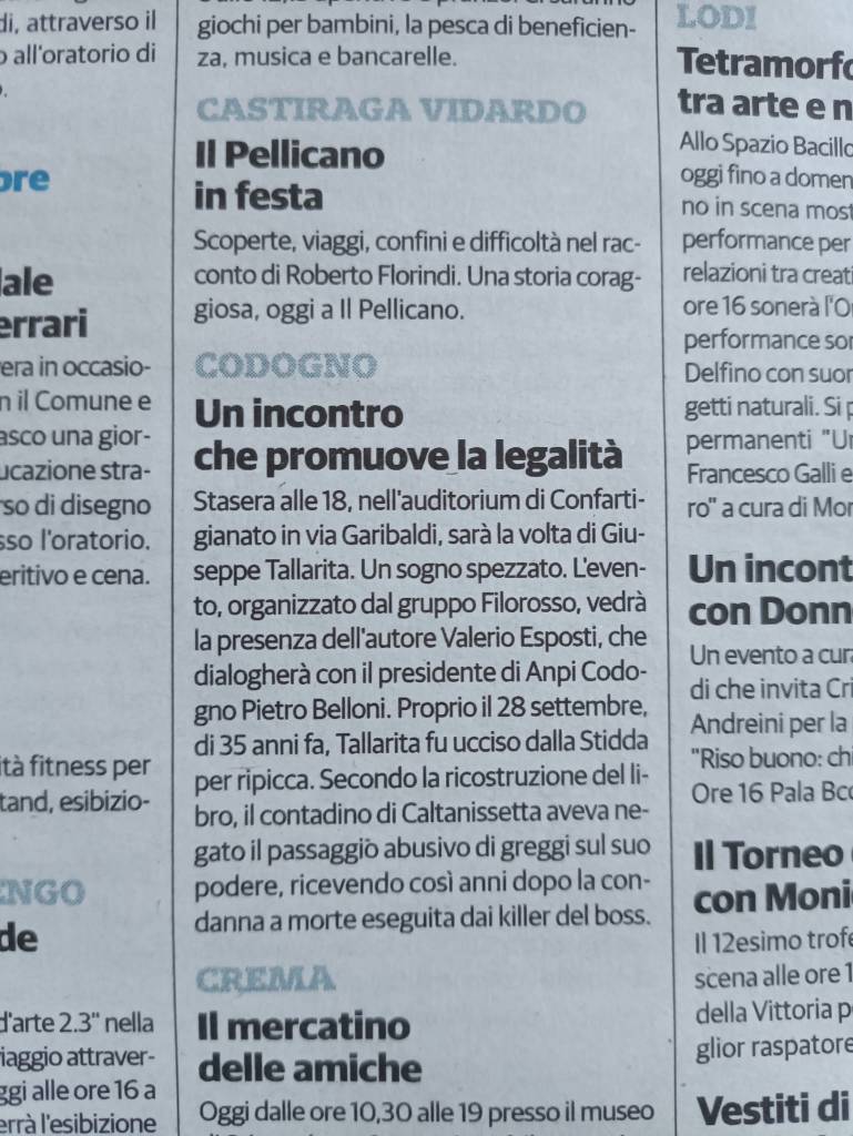 Un pubblico partecipe ha assistito domenica 28 settembre 2025, presso la sede di Confartigianato Codogno, alla toccante presentazione del libro “Un sogno spezzato” di Valerio Esposti, dedicato alla figura di Giuseppe Tallarita, vittima innocente di mafia.