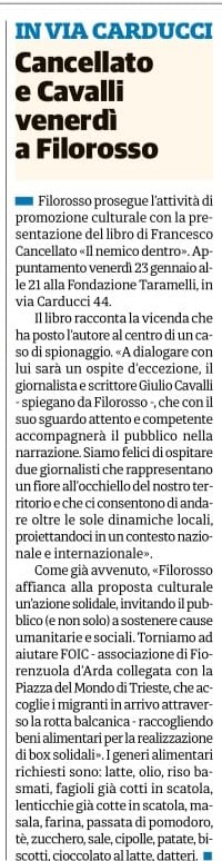 Al centro dell’incontro, la presentazione del libro “Il nemico dentro” di Francesco Cancellato, che racconta la vicenda di spionaggio che lo ha coinvolto personalmente. Un caso che ha aperto una discussione importante sul ruolo del giornalismo, sulla libertà di stampa e sui rischi legati alla sorveglianza.